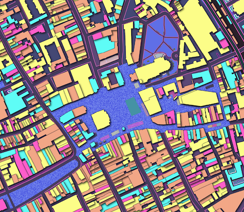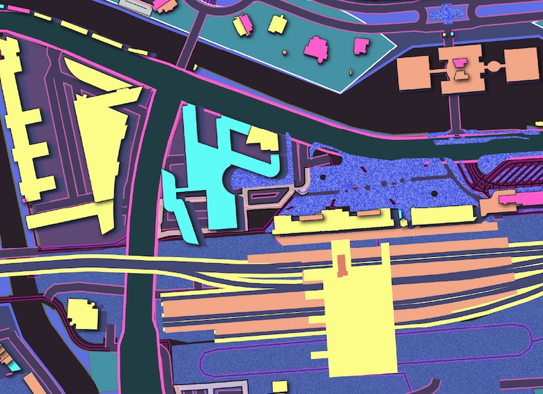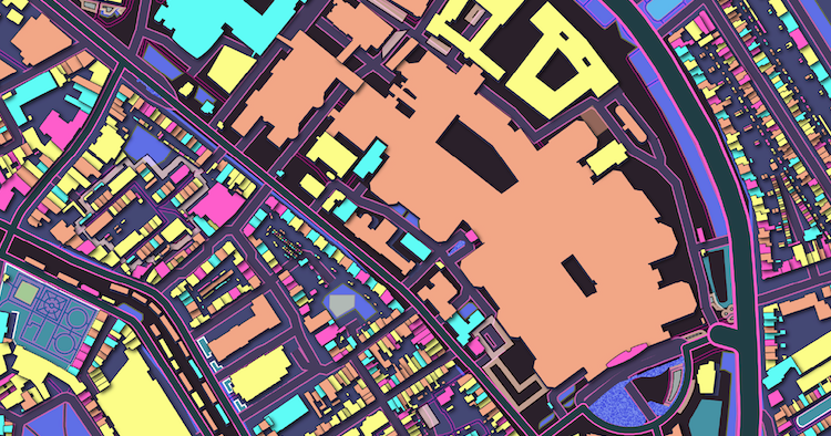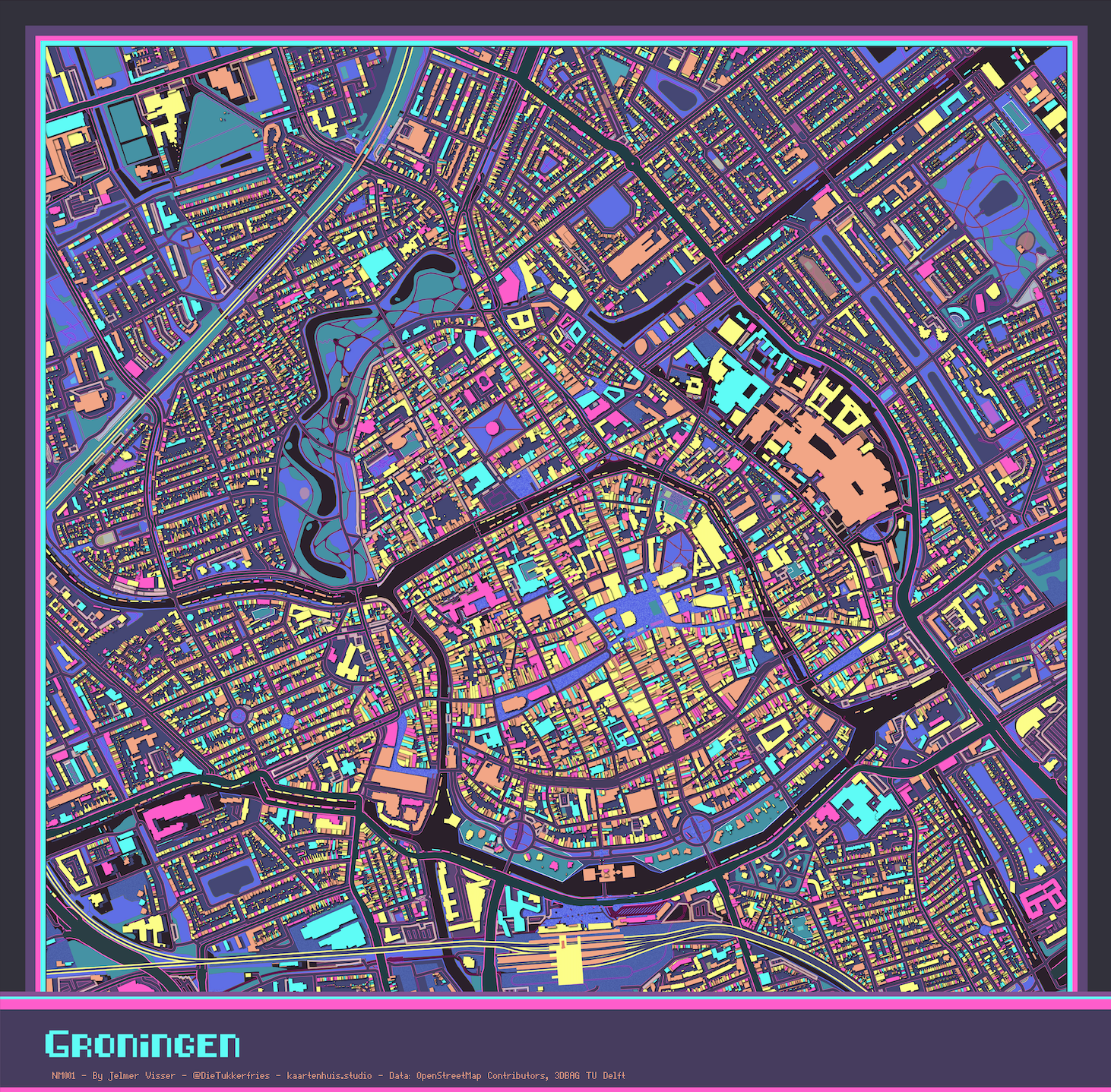 De Night Mode-kaart van Groningen met het kleurenpalet 'discodip'.