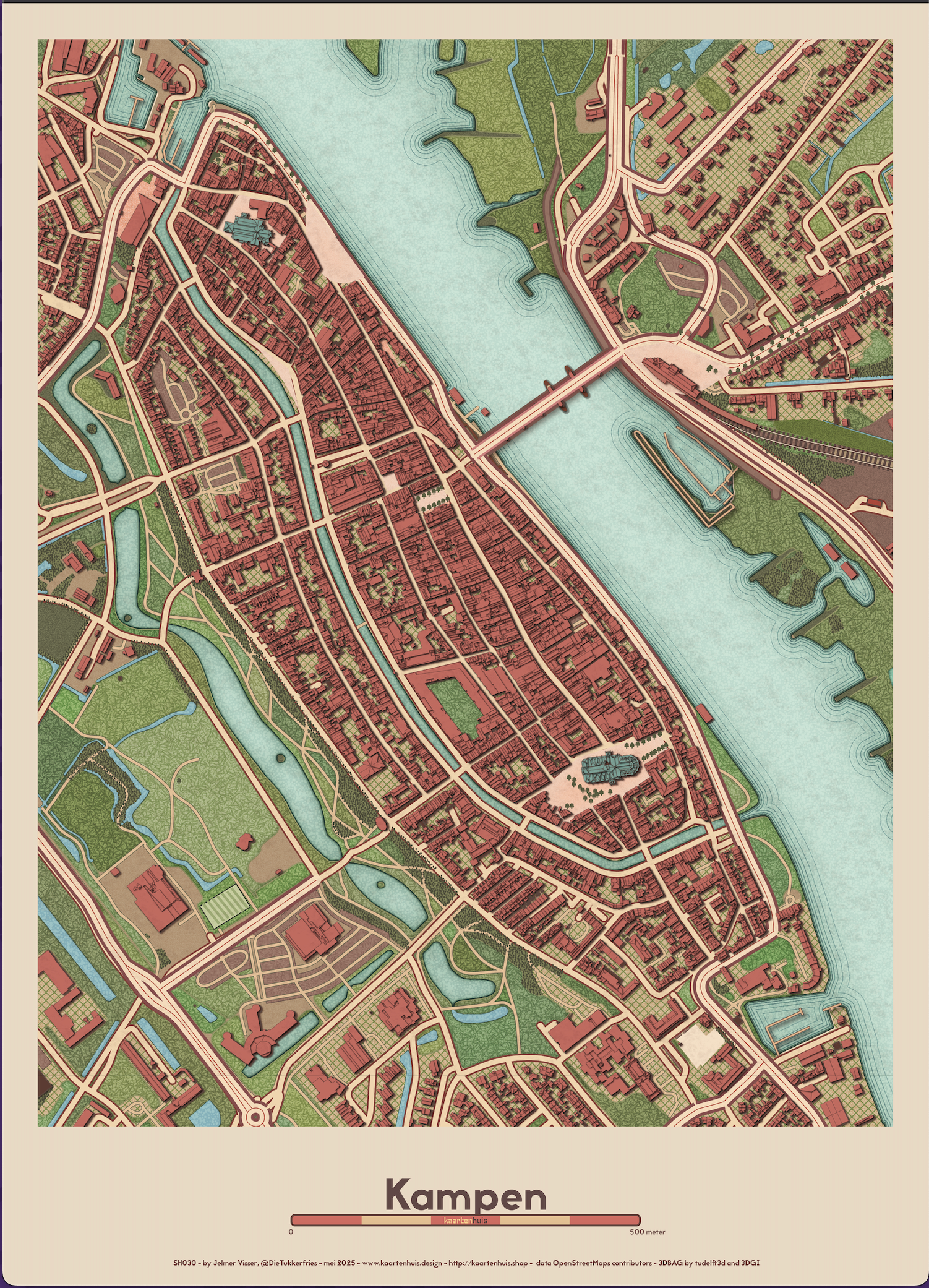 De stadskaart van de historische kern van Kampen in het klassieke zeventiende eeuwse kleurenpalet. Verkrijgbaar op vijf formaten en op twee materialen.