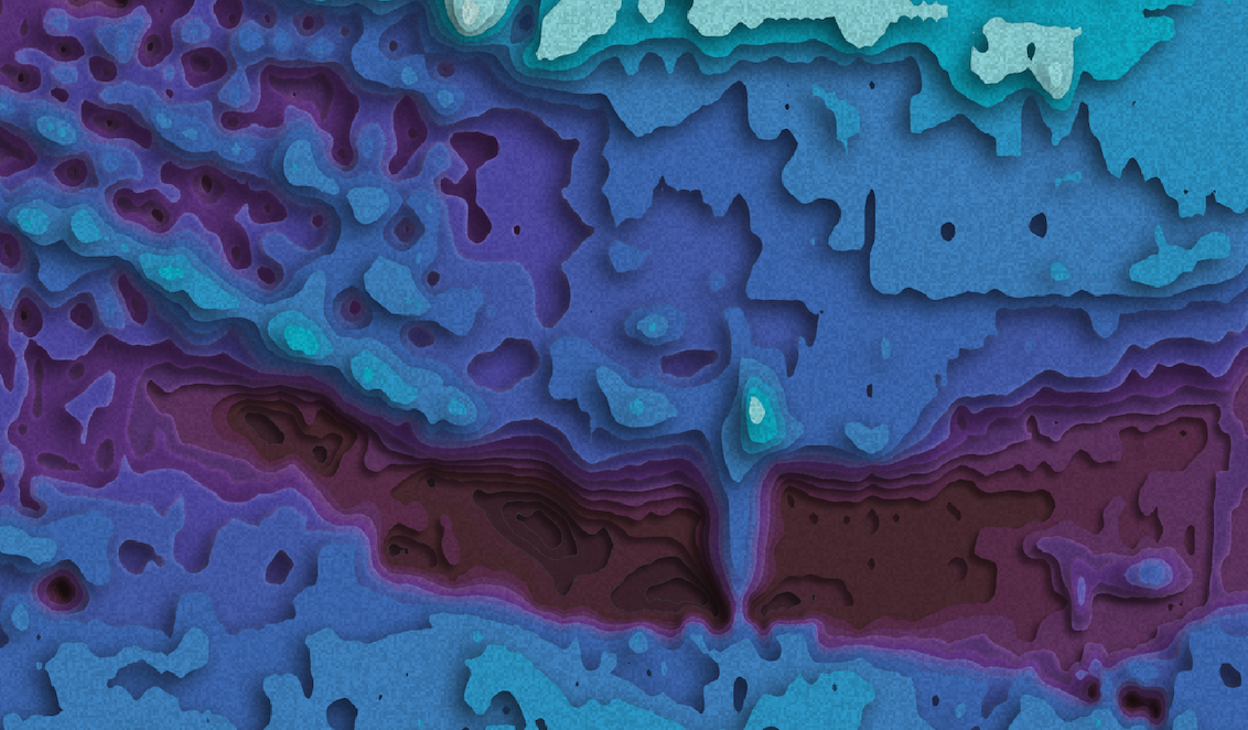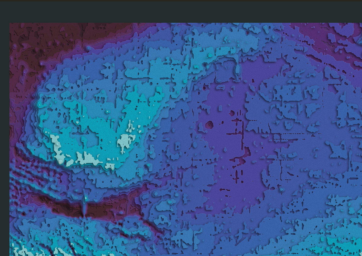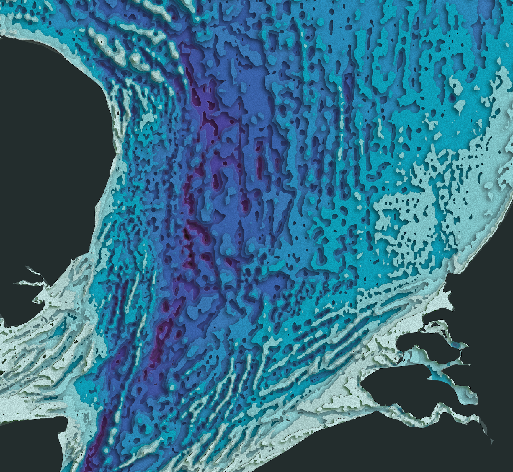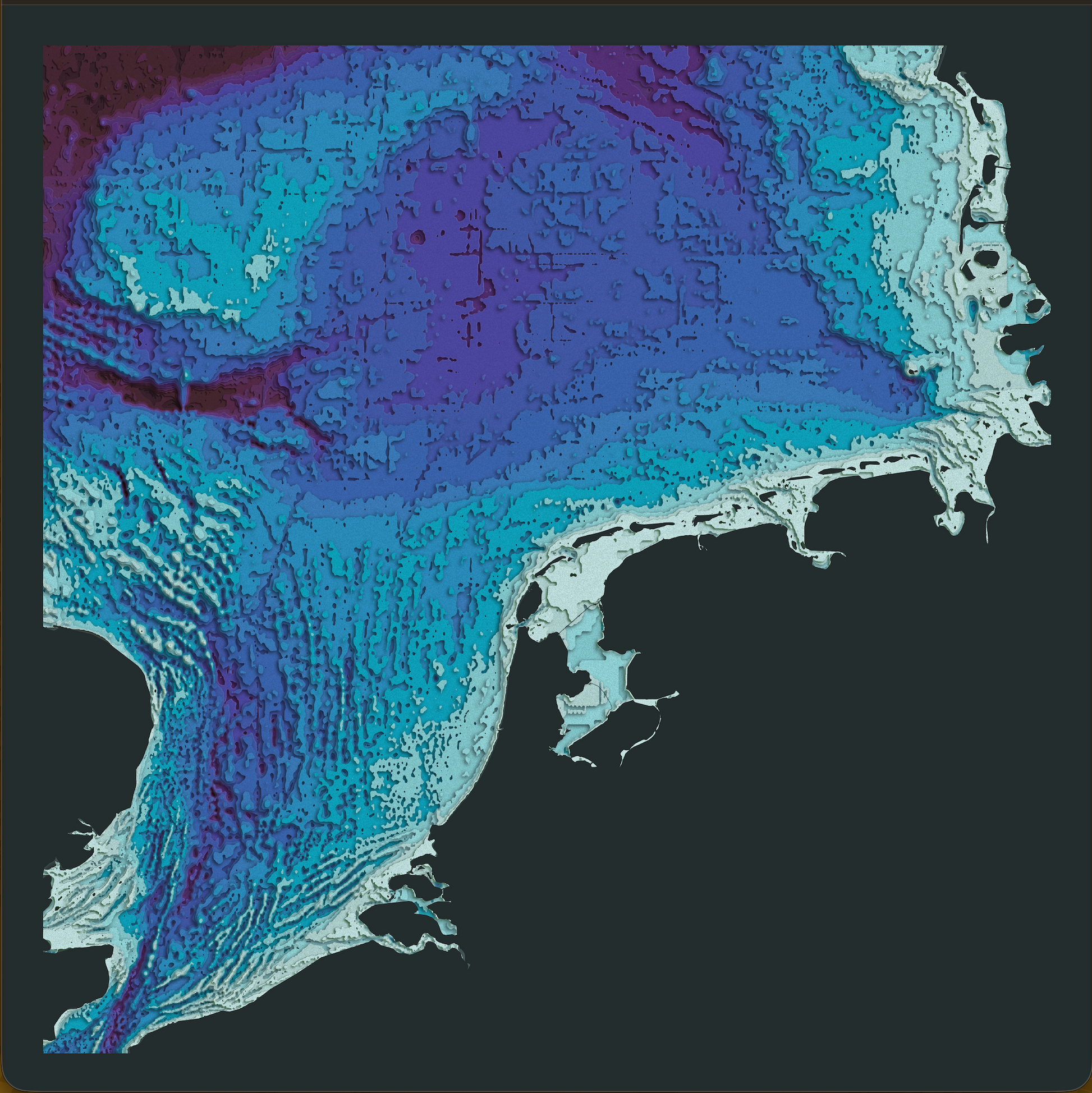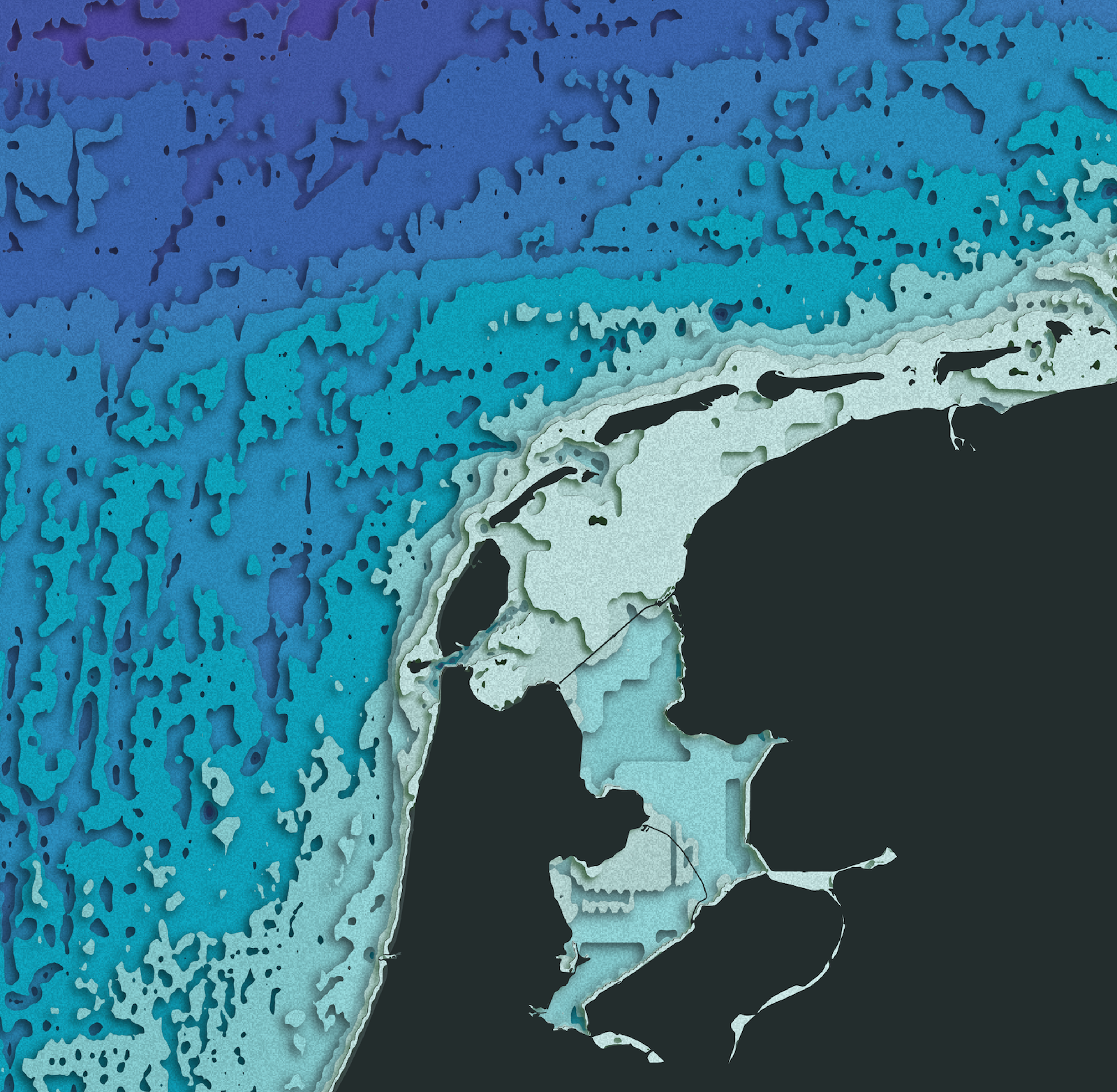 De Night Mode-kaart van de Noordzee met het kleurenpalet 'Suicune' De kleuren van de contourlijnen zijn gebaseerd op de bathymetrische data van Eurostat met etages van 5 meter diepte.