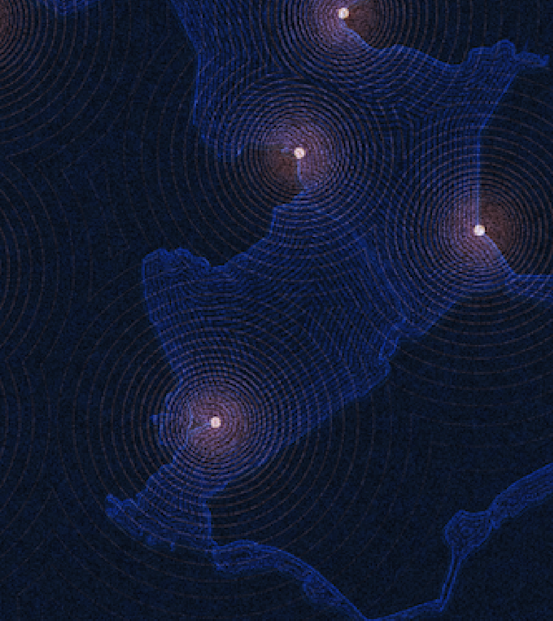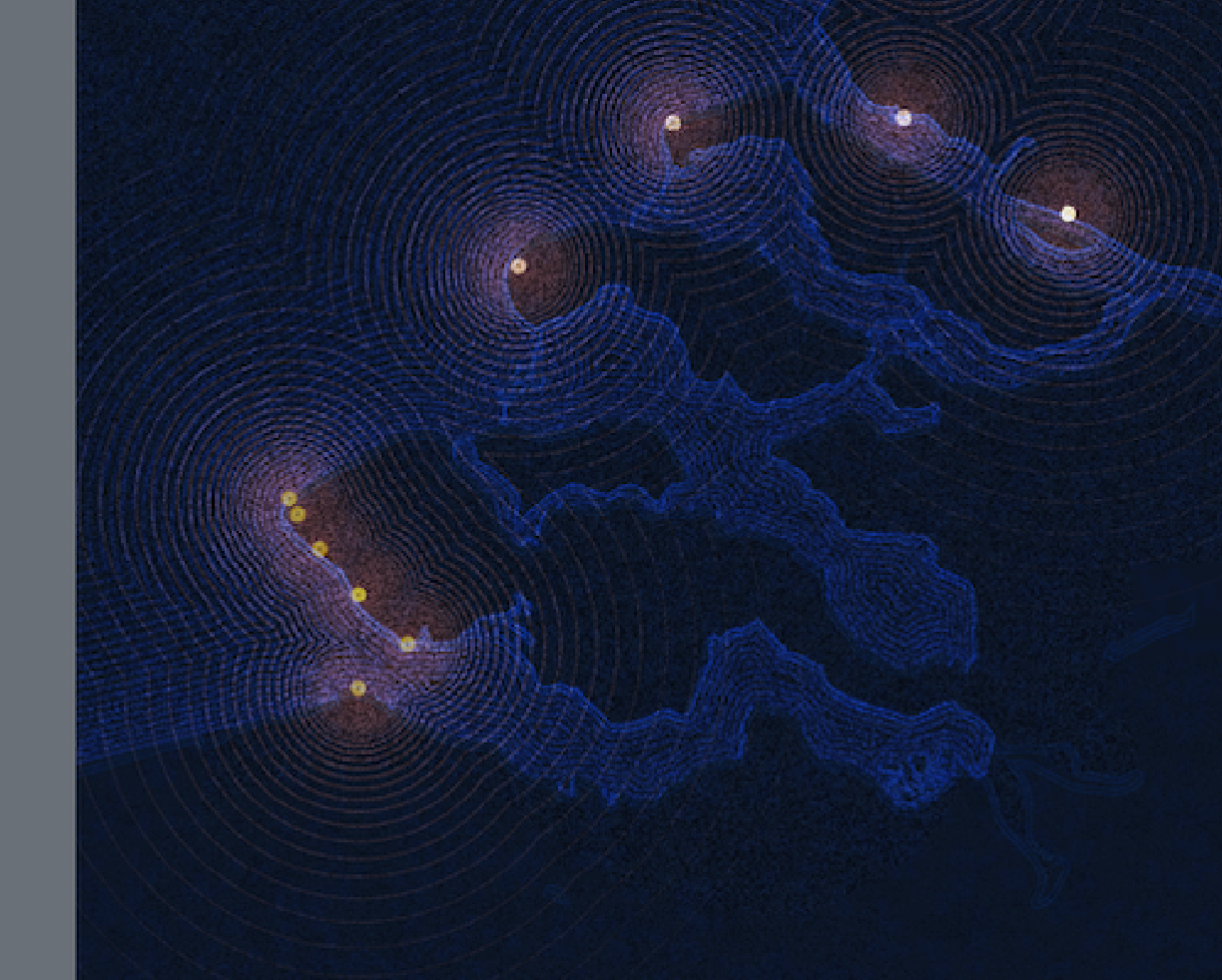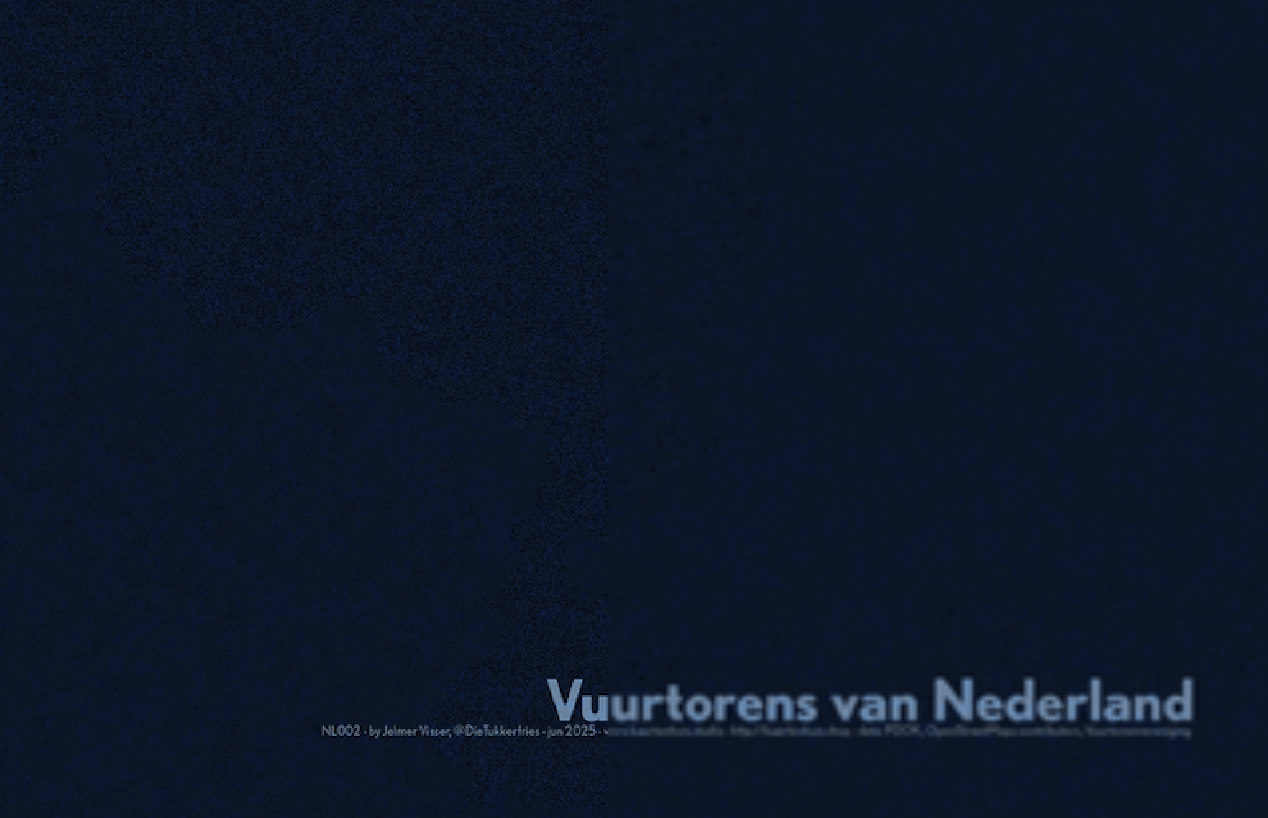 Een minimalistische en nachtelijke kaart van Nederland met alle 35 actieve vuurtorens van Nederland die gezamenlijk de kenmerkende kustlijn van het land vormen. De print is verkrijgbaar op zowel 250 grams papier en op een Dibondplaat.