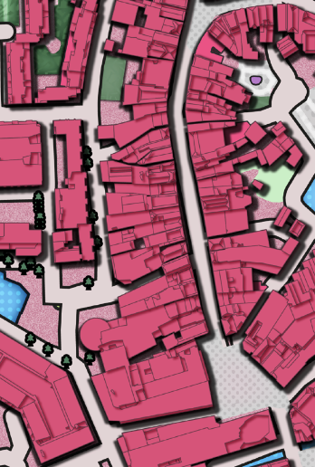 De stadskaart van Almelo in de 'Leeuwardenstijl' waarin het kersenroze van de bebouwing en het heldere blauw van het water en groen van de groene zones een prettige mix vormen van klassieke en moderne elementen.