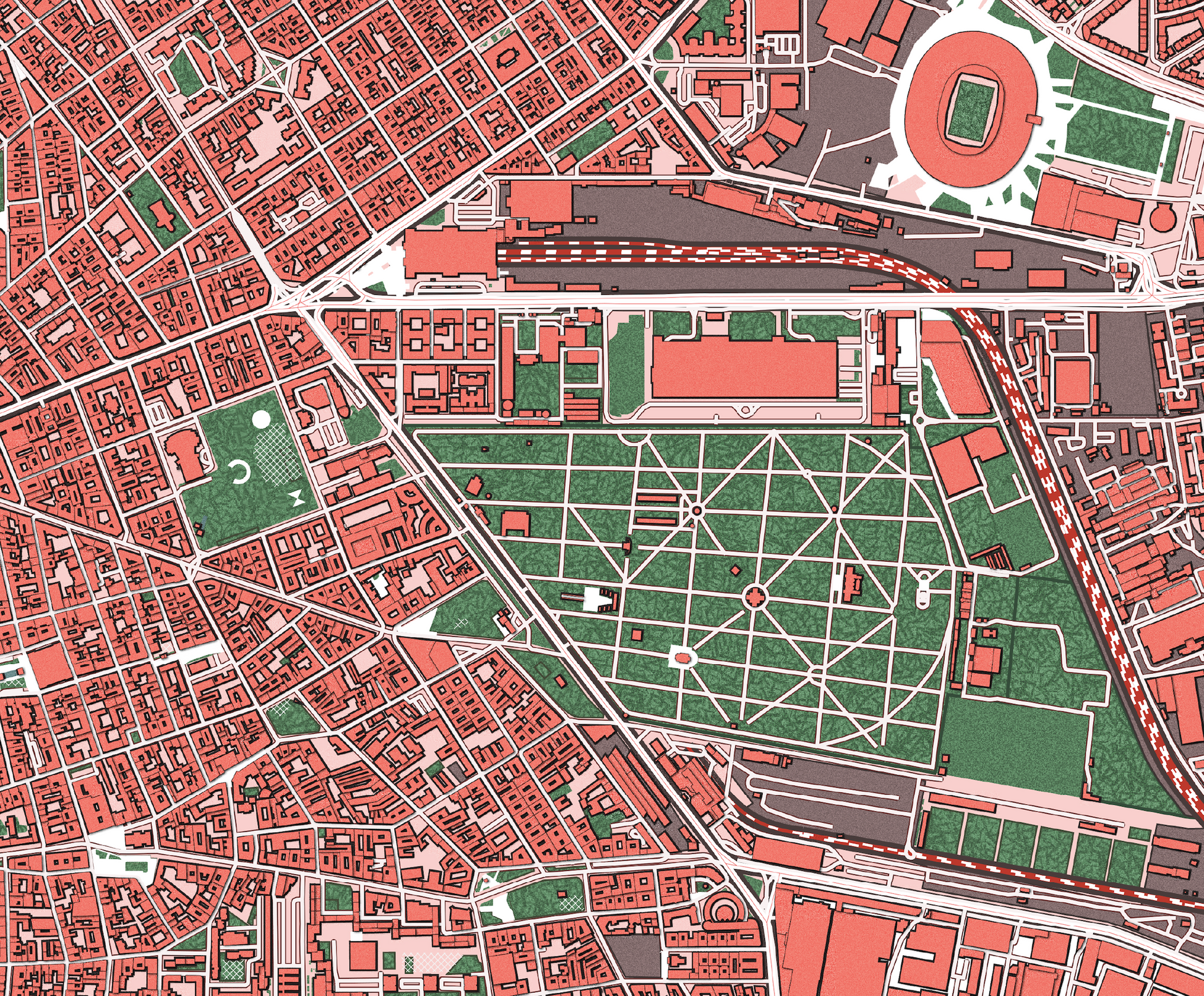 Een kleurrijke stadskaart van de Hongaarse hoofdstad Boedapest/Budapest in een rood-wit-groene kleurstelling die overeenkomt met de Hongaarse vlag. Spot jij het imposante Hongaarse parlementsgebouw, de meanderende Donau, de Burcht van Boeda, de Vissersburcht en de Kettingbrug?