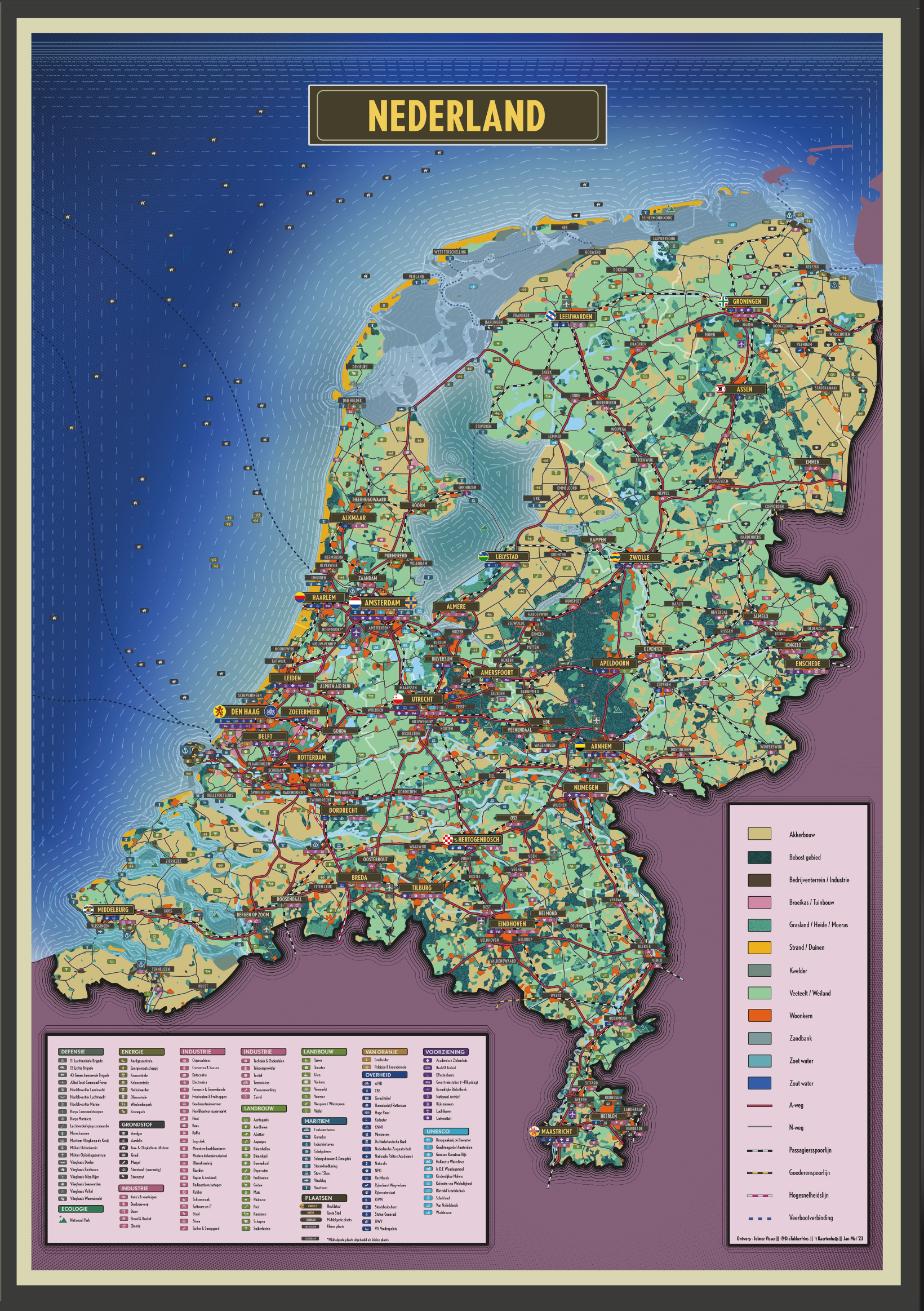 Moderne variant op een economische schoolplaat van Nederland uit de jaren ‘50 met een speels kleurenpalet en uitzonderlijk veel kaartlagen, waaronder bodemgebruik, wegennet, spoorwegen, landbouw, industrie, overheid, defensie, energie, ecologie en UNESCO-werelderfgoed.