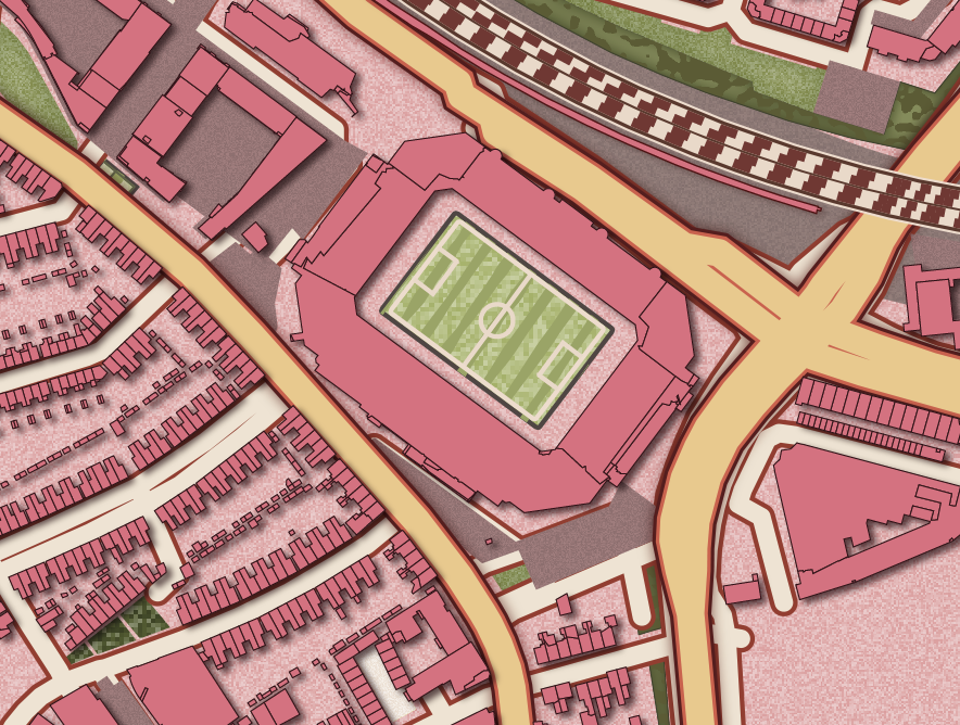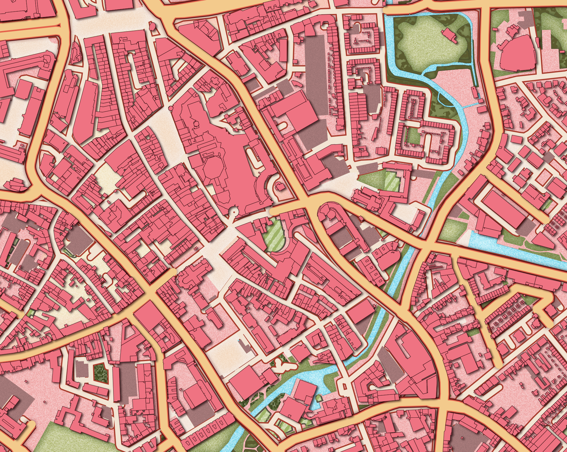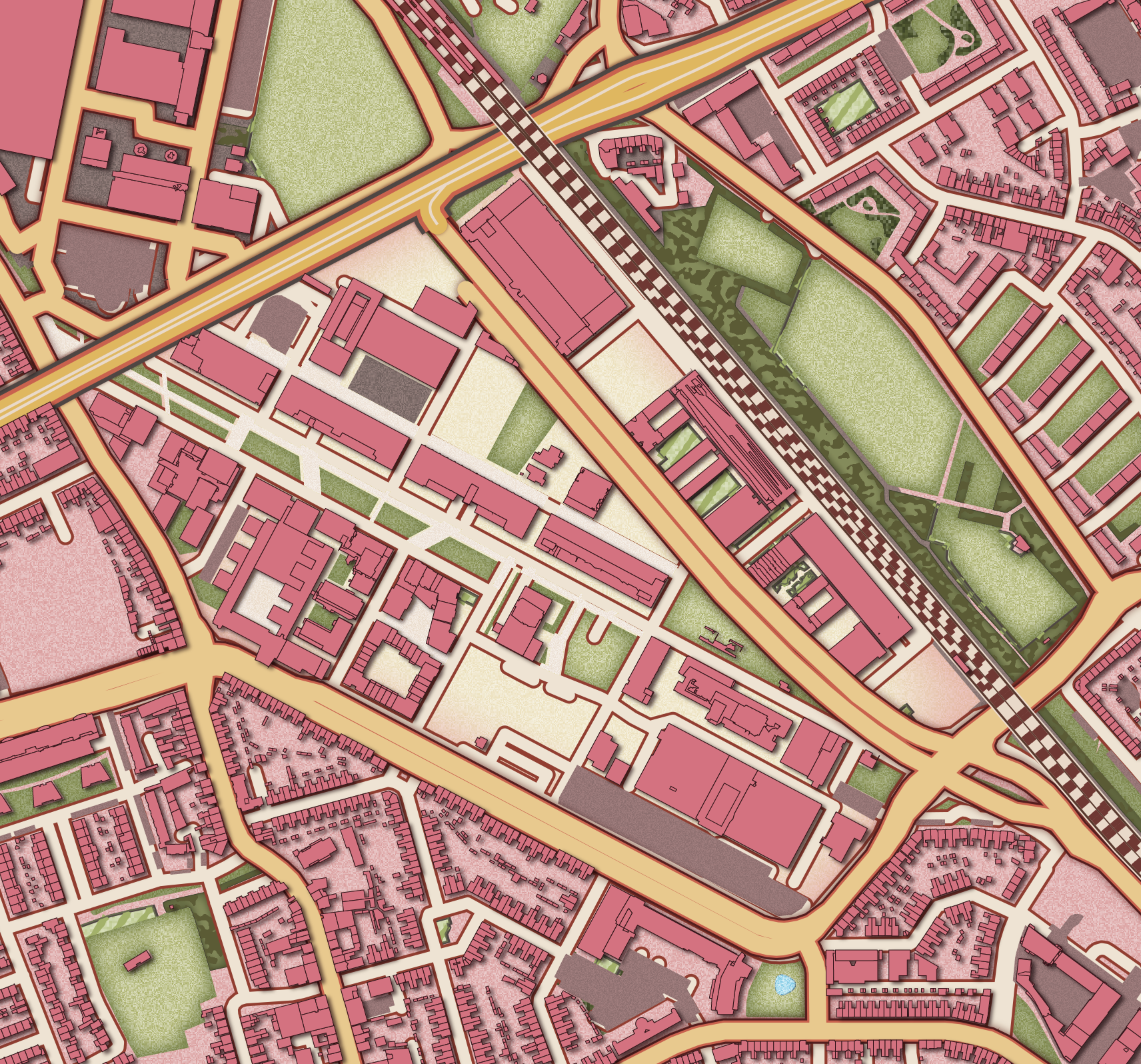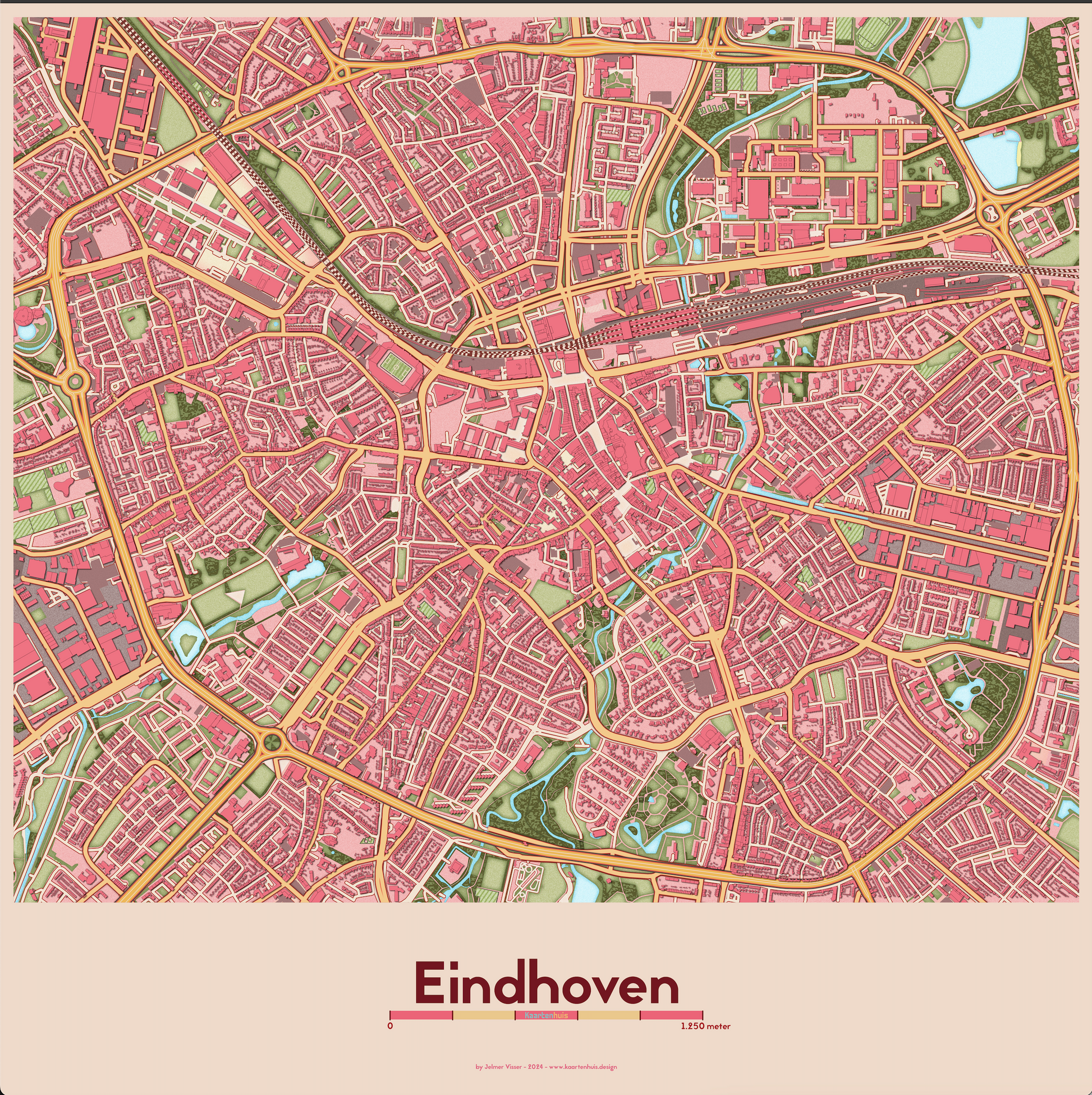 De stadskaart van Eindhoven in de "Arnhemstijl", geïnspireerd op de optimistische pastelpaletten uit de jaren '50 van de twintigste eeuw waarin rondwegen werden beschouwd als de ultieme vorm van vooruitgang en vrijheid, benadrukt met een heldere gele kleur.