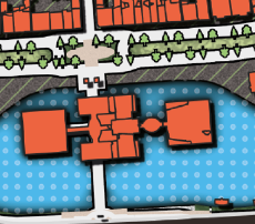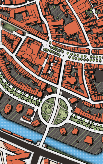 De stadskaart van Groningen in de 'Groningen-stijl' met een prominente rol voor het Gronings-rood, de klassieke baksteenkleur die op deze kaart is terug te vinden in de gebouwen.