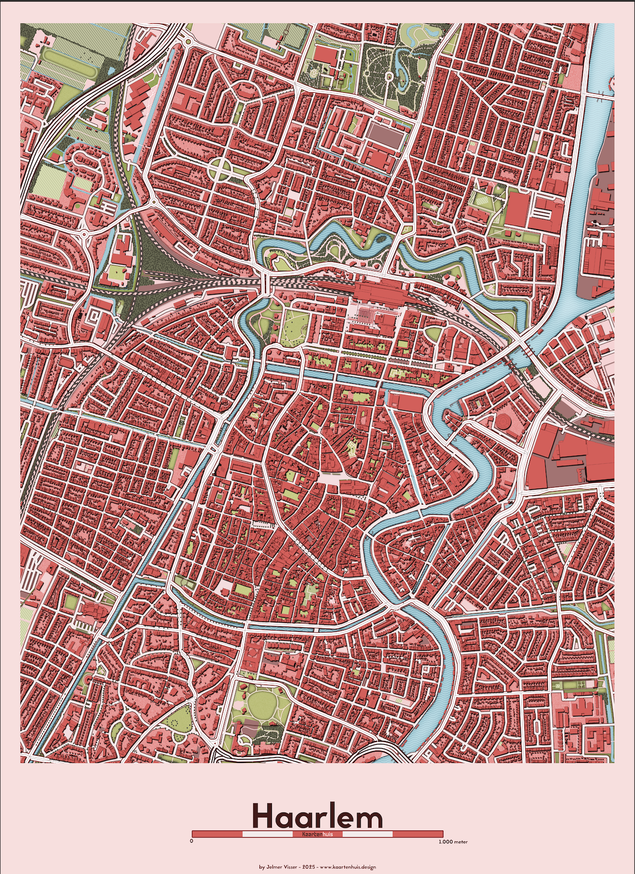 De vintage stadskaart van de binnenstad van Haarlem met een matte coatinglaag voor extra bescherming en mooiere kleuren. Verkrijgbaar in 4 formaten en 2 materialen.