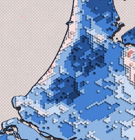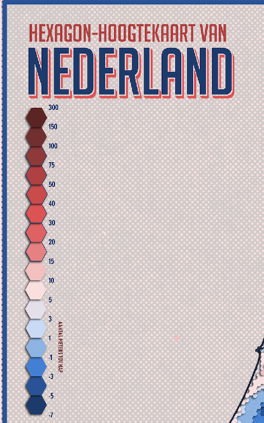 Een speelse vintage reliëfkaart van Nederland. Het kleurenpalet is geïnspireerd op de Nederlandse driekleur en bij het kleurverloop is extra rekening gehouden met de uitzonderlijk kleine hoogteverschillen in Nederland, waardoor het toch 'een beetje' heuvelachtig lijkt.