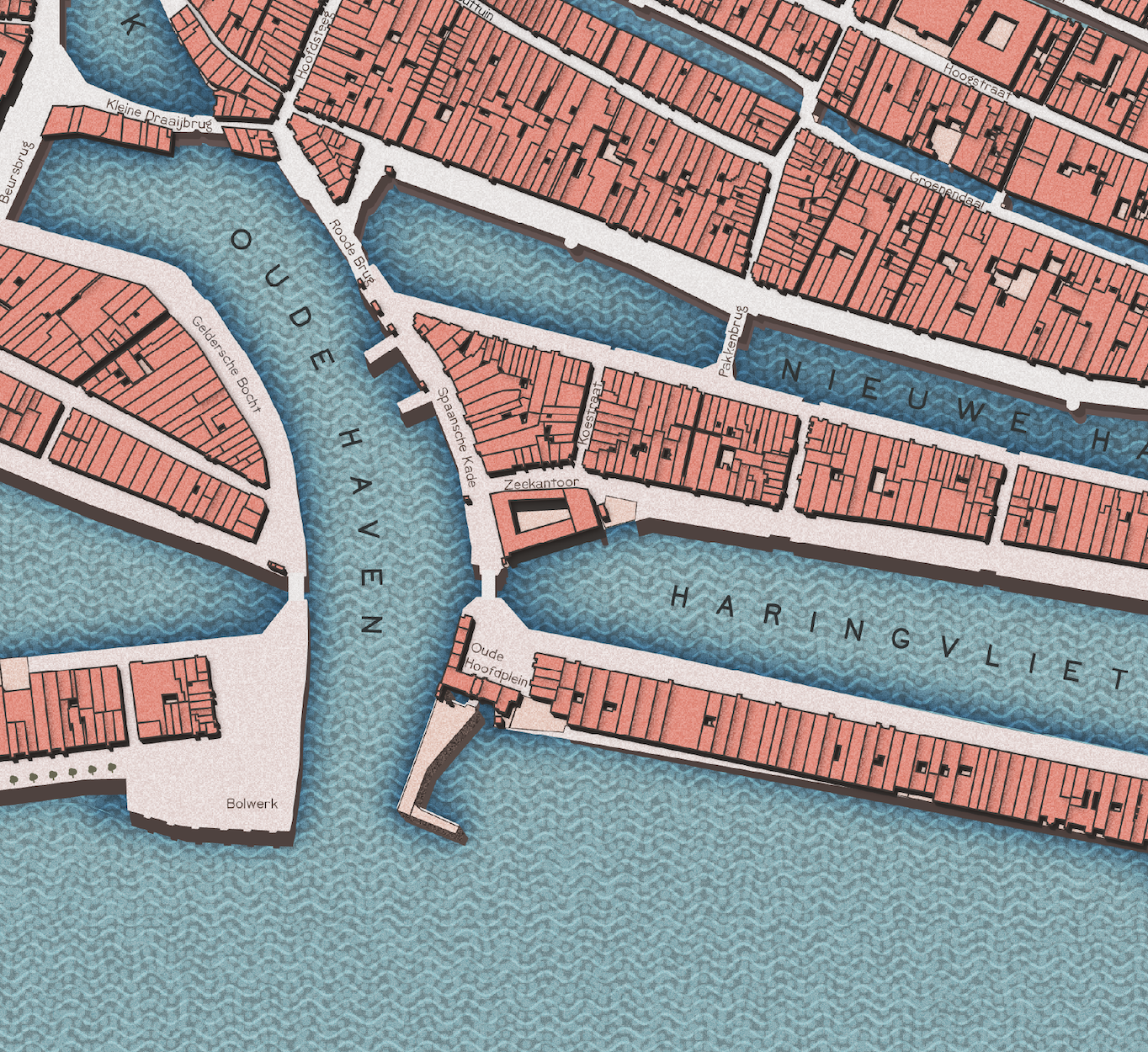 Een zeer bijzondere stadskaart van Rotterdam op basis van de Kadaster-gegevens uit het jaar 1832, verstrekt door de KNAW. Ingekleurd met het klassieke oranje, wit, blauwe kaartenkleurenpalet voor een mooi contrast tussen bebouwing en water. Met straatnamen.