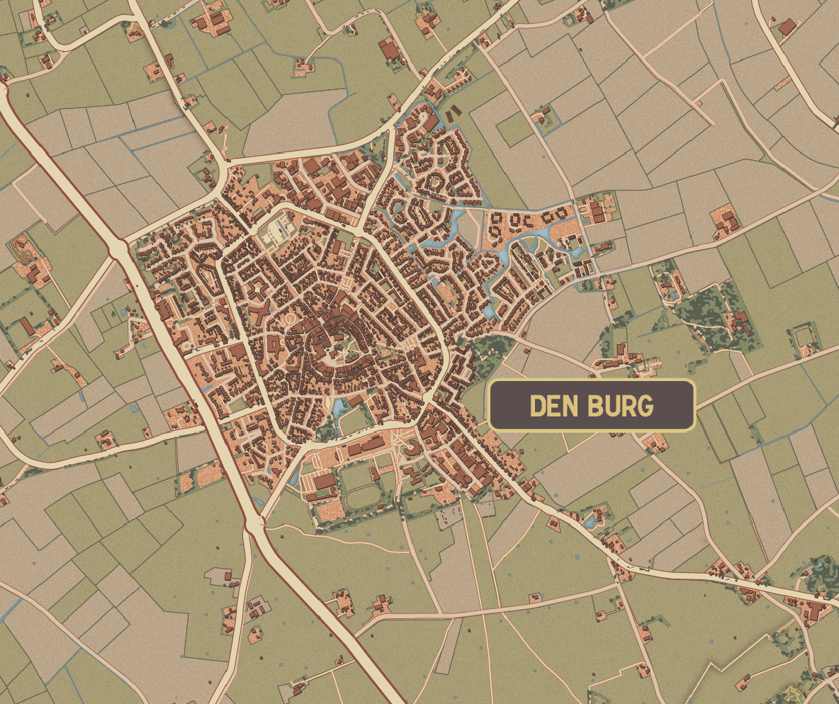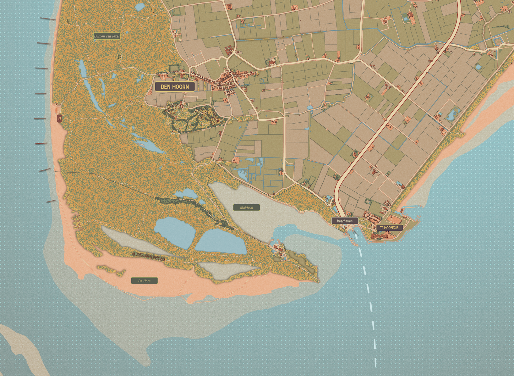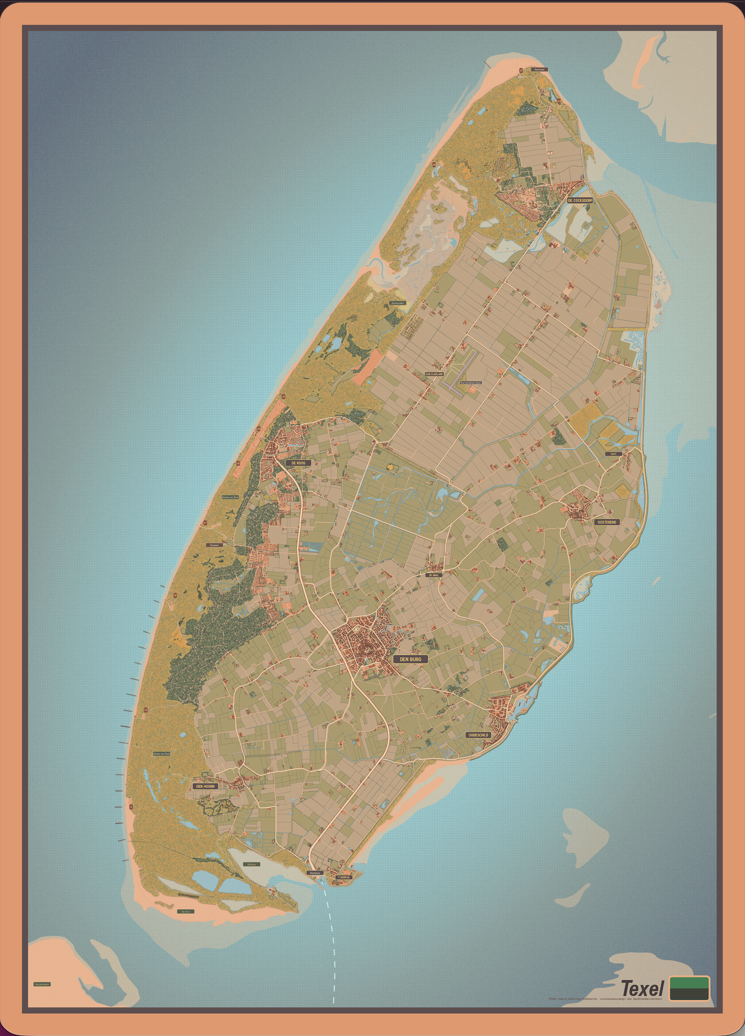 De eilandkaart van Texel in een vrolijk en zomers kleurenpalet die doet denken aan een zonnige zomervakantie van vroeger met veel ruimte voor details. Plaatsnamen, strandpalen en prominente locaties inbegrepen.