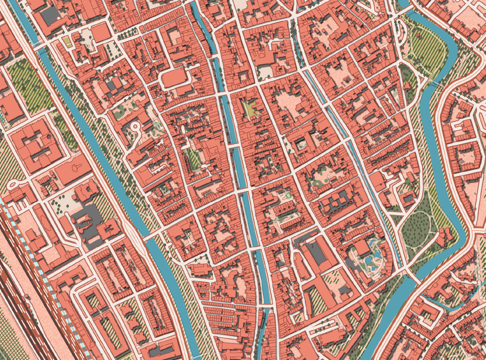 De stadskaart van Utrecht in de klassieke oranje, blauwe groene stijl. Kleinere schaal dan de originele Utrecht-kaart.